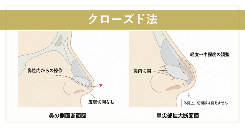 - クローズド法は、鼻の内部、つまり鼻の穴の中から切開する手法です。外部に切開部が見えないため、傷跡が外に残らないのが特徴です。