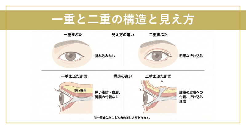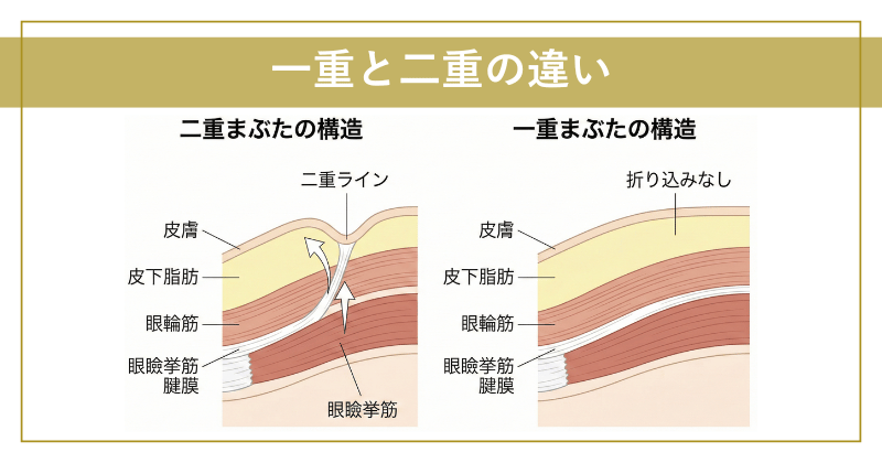 二重まぶたは、まぶたを持ち上げる筋肉(眼瞼挙筋)の腱膜が皮膚に付着することで形成されます。この付着により、目を開いた時に皮膚が折り込まれ、二重のラインができます。一重まぶたの場合、この付着が弱いか、脂肪や皮膚の厚みにより二重ラインが形成されません。