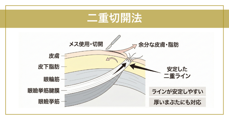 切開法は、まぶたの皮膚を切開して二重ラインを作る方法です。埋没法と比較してより確実で持続性の高い効果が得られますが、ダウンタイムが長く、傷跡が残る可能性があります。特に、まぶたの皮膚が厚い方や、脂肪が多い方に適しています。