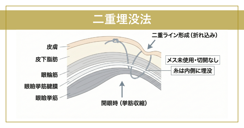 埋没法には、2点留め、3点留め、4点留めなどの種類があり、希望する二重の幅や持続性に応じて選択します。点数が多いほど持続性は高くなりますが、その分費用も高くなります。効果は半永久的ですが、まれに糸が取れることがあります。