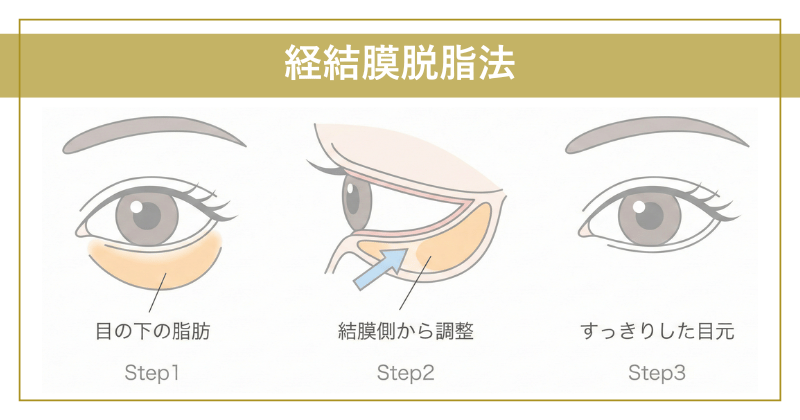 経結膜脱脂法は、下まぶたの裏側(結膜側)から脂肪を取り除く、切らない目の下の脂肪取りです。