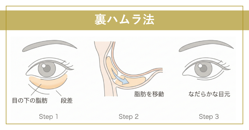 裏ハムラ法は、脂肪を単に取るのではなく、下方向に移動・固定して凹凸をならす「再配置型の脂肪治療」です。