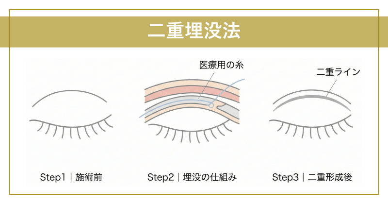 埋没法は、まぶたの内側に医療用の糸を通し、皮膚とまぶたの組織を数点で固定することで二重ラインを形成する方法です。