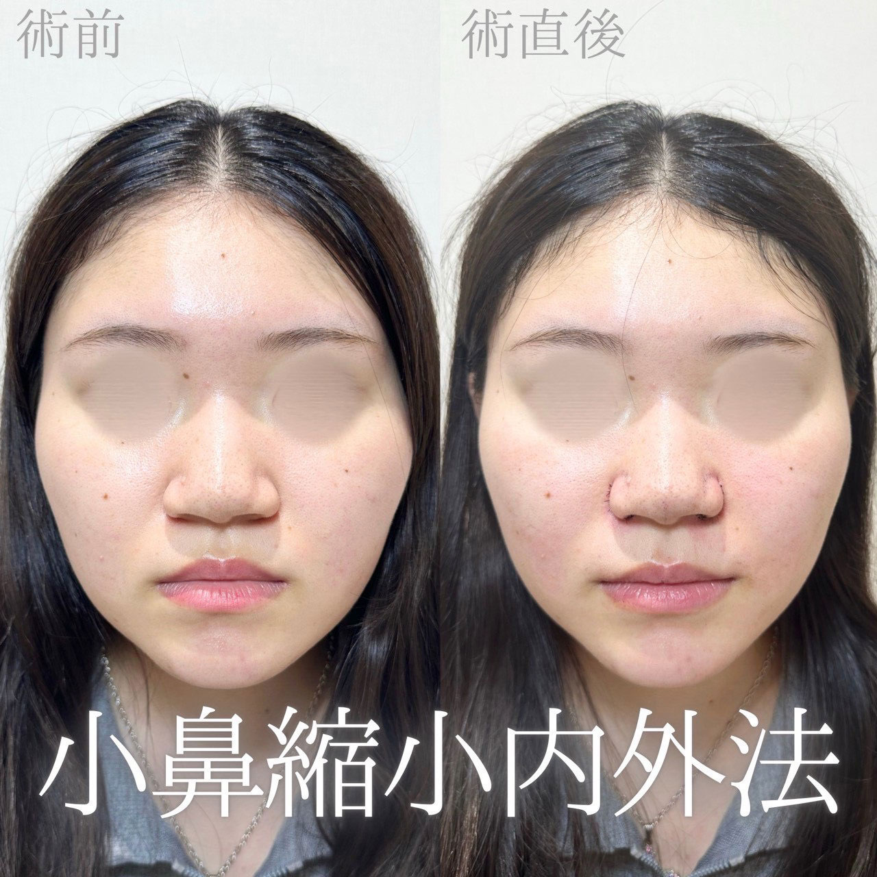 横への張り出しや広がりを根本的に改善します。特に、笑ったときに小鼻が広がる現象を抑えるのに効果的です。また、他の鼻翼縮小術(外側法など)と併用することで、組織が元に戻ろうとする後戻りを最小限に抑えることができます。