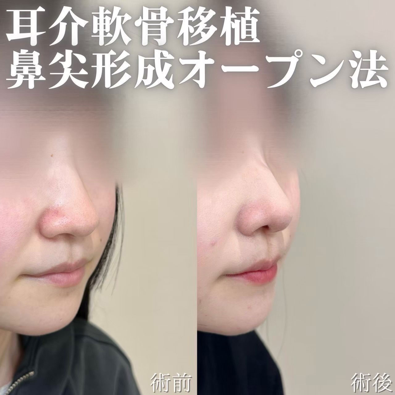 この施術は、鼻中隔軟骨に耳介軟骨を移植して延長することで、鼻先を前下方に下げることを目的としています。